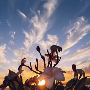 プルメリアピンク🩷&夕焼け 昨日の夕暮れ。 蒸し暑いですが、風は吹き抜けています。