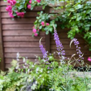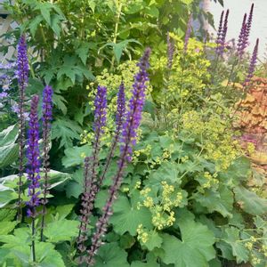 おはようございます☀サルビア ネモローサ カラドンナとアルケミラモリスが咲いてくれました🌸 どこかのガーデンで見かけてナチュラル感に憧れて💕過去2年ほどサルビアが植えた場所が悪かったのかうまく行きませんでしたが、今年は土壌改良もちゃんとやったら咲いてくれました🩷 ミヤコワスレは鳥さんの落とし物かな?いつのまにか生えてました😊