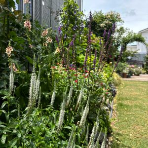 PW『ベロニカウィザーディングホワイトワンズ』 去年からですが 今年も涼しげに出てきました❁⃘𖤣𖥧*゚. 手前はバーバスカムの葉っぱが被って倒れてたので 葉っぱ数枚カット✂️してます 隣に同じ縦ラインのカラドンナ💜 サルビアミラージュ❤️も強剪定✂️したのにモリモリ ミラージュは💜❤️2本植えてたのに どちらも❤️に…染まって…💦