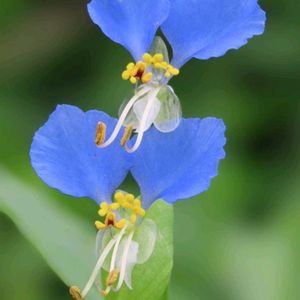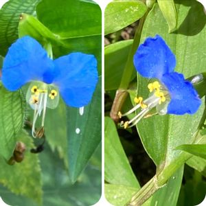 ツユクサ(露草) ①②③ 鮮やかな青色✨💙🩵の花びら ・2枚の花びらは大きくよく目立つが、3枚目は小さく色も透きとおった白で目立たない🤍 ・青い花びらの近くにあるおしべ3個は綺麗な黄色をしているが、花粉を出さない。仮雄蕊。 ・花は、半日でしぼむ ・日本全土に分布 なんとも面白い花💕💕🩵 ① 2024.8.14撮影 ②③ 2024.8.1 撮影
