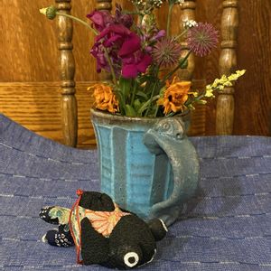 毎月10日はトトの日。 私、クロデメキンが好きでして💕 このデメキンちゃん、匂い袋なんです。その昔、成田空港のギフトショップで見つけたもの。 お花は久しぶりに行ったコミュニティガーデンで、カットして来ました。すっかり冬枯れですが、まだ少しお花が残っていました。 お花を挿したマグカップは、先日のホリデーバザールでゲット。 よく見たら持ち手に顔が😃 作者のおじさんが、ウィルバーと名前をつけたそうです😄 何か愛嬌があるというか、キモカワではありませんか🤣💕 カットして来たお花だけでは少しさびしいので、フェイクのお花を足しました。ピンクのアザミみたいに見えるのがフェイクです😁