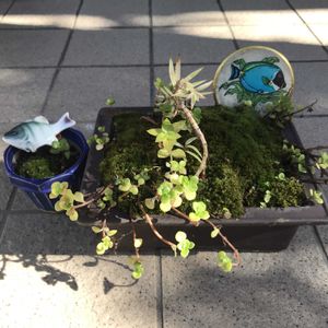 こんばんは😃🌃 🏷️トトの日 トトさん頑張って夏越してね🐟🐟🐟 サニコさんのタコ鉢🐙ミニクジラ鉢 ピンクパンサーさんのネーム付き水族館鉢お気に入りです😌 まつぴよさんのおさかなさん🐟 夕方 ayamekaさんのリメ缶に寄せ植えしました🌱 繋がりに感謝です😌💓