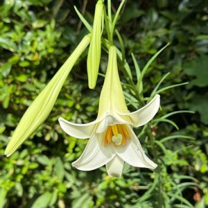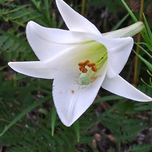 土手花壇に咲いているタカサゴユリ(高砂百合)です。 ピンクの筋が入ってます。 別名:ホソバテッポウユリ