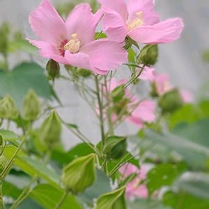 昨日の、今日のお花 フヨウ(アオイ科)🩷優しい一重のピンク① ご近所さんの、大きな酔芙蓉 🤍白から🩷ピンク、最後はクシュクシュの💗②③④