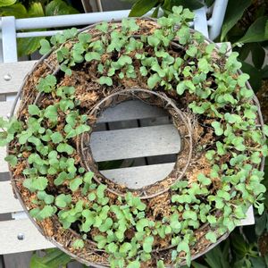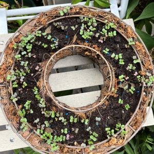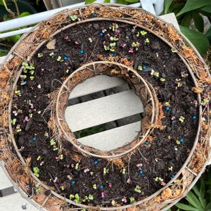 ハボタン直播きリース 3日目にして発芽確認しました🌱 殺虫剤は土に混ぜ込んだので虫🐛はしばらく大丈夫と思うけど、心配はナメクジ🐌とバッタ🦗だな😥 これからどうなるか、楽しみです😊 ①9月15日 作成、種まき ②9月18日 発芽確認