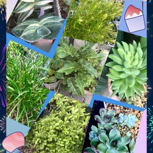 小さな庭の植物たち 夏の姿です🌴🌵☘️ この二、三日、雨が降って元気を維持してくれて います(*^^*) ↖️白絹姫錦 ⬆️フェニックスゴールド ⬅️姫タカノハススキ 真ん中 クッカバラ ➡️樹氷 ⬇️ツルマンネングサ ↘️紫バラ交配 名前不詳 不安定なお天気もありますが皆さまご安全にお過ごし下さいね🥰