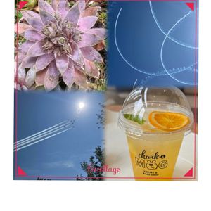 ↖️センペルの花を切った その後 たくさん生えてきた 見た目は新芽みたいだけど また花なのか?観察中 ↗️↙️ 大阪万博でブルーインパルス が飛んだと行かれた 皆さんが投稿してて いいなぁと思ったら 高校時代の仲良しからも LINEで送ってくれた *⋆✈︎前に厚木飛行場 だったか?見た気が するけどね ↘️今日はリフォームお休みで 先程 飲んだオレンジピールの 爽やかソーダ 軽い苦味が爽やかでした🍊😋