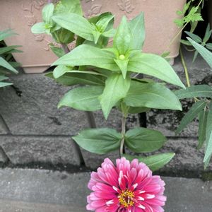 ①種こぼれからの百日草🌸 垂れ下がって咲いていますが、お花は意外と大きくなりました ②タカサゴユリ 増えすぎるので花殻摘みをします