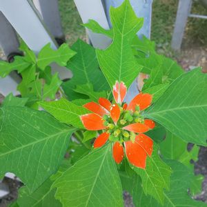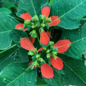 花友さんの庭に咲くショウジョウソウ(猩猩草)です。サマーポインセチアともいわれてます。 朱色の葉っぱです。花❀は中心部に咲いてます。