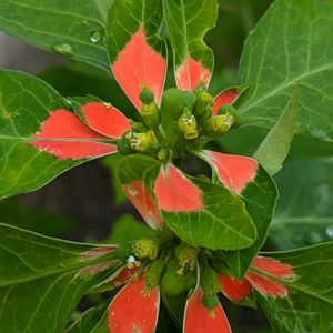 猩猩草(ショウジョウソウ) 毎年、種から育ててます。 今年も色付いてきました😊 山の麓で、一見花にも見えるこの葉色に感激して、抜き帰って我が家で育てだしたのがきっかけ。 花そのものはかなり地味💦 この色付いた葉を花だと見たほうがいいかもね😅