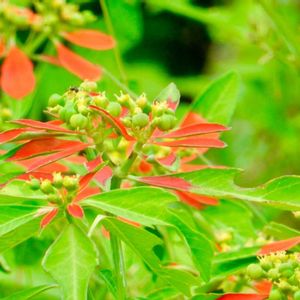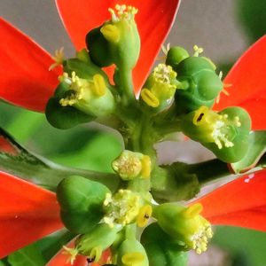 サマーポインセチア 真っ赤な苞葉と控えめなお花 種が成長してきました 種は元気に弾いて飛んでいきます