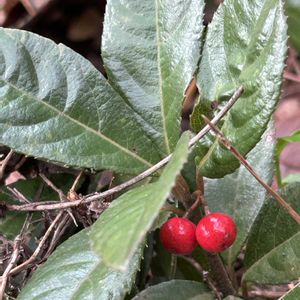 おはようございます☁️ 丘陵地にて 色々な果実 1️⃣ヤブコウジ 林間に良く見られる。 十両とも言われます。 サクラソウ科ヤブコウジ属 常緑広葉小低木 2️⃣スイカズラ スイカズラ科 半常緑の木質のつる性植物 実は、2個並んでつく。毒性のある物もある。鳥が食べる。 3️⃣フユイチゴ 丘陵地や山の麓辺りに多く見られます。食べられます。酸味は弱く甘い。 バラ科キイチゴ属 4️⃣ヤマガキ 柿の原種? 小さな実が地面に落ちていて上を見たら沢山なっていました。