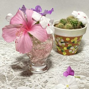 アレンジのお花 ピンクのハイビスカス🌺 ビンカ ペチュニアを 寄せてみた 少し涼しくなって🌺も 夕方まで綺麗に咲いてる 手書きのリメバチにサボテン 入れてみました 可愛く仕上がったかな 自画自賛🤣🤣🤣 久しぶりのペイント 汚い出来上がりだけど 満足してる😂😂😂 ②③④⑤ 今朝に咲いたあさがお まだまだ蕾あるので 楽しめそうです もう乱れまくって咲いてます😆