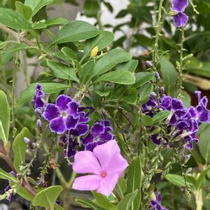 今朝の青系のお花たち じゅらんた宝塚 日々草 ピンク🩷 アメジストセージ ハツユキソウ フジバカマ メラレウカ カリブラコア 桔梗の後ろ姿 ブーゲンビリア 露草 毎日沢山の露草咲き乱れて お花だけ積んでトッピング