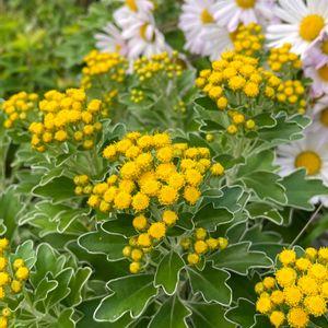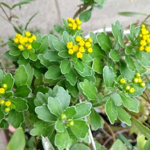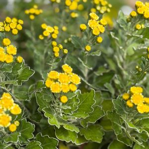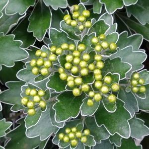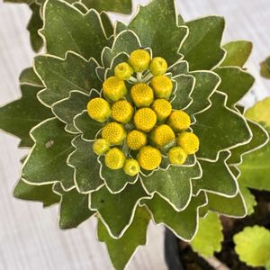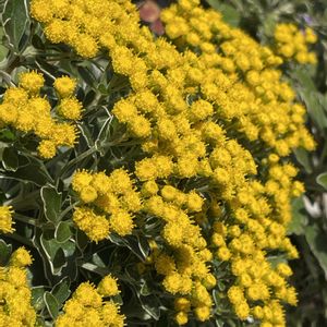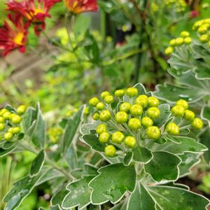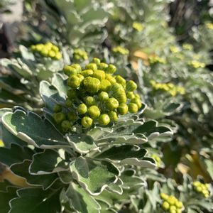 イソギク イソギクは海浜植物。 日本在来の固有種。 🟡園芸店で購入して10年ほど。 増えています♪ 草丈が30~40cmほどの常緑性多年草で、 一度植栽すると永年的に生育します。 またイソギクは密生し、11 月~12 月にかけて黄色い花を一面に咲かせます。 特徴: 葉っぱに白っぽいエッジがあり、花弁のないポンポンとした丸い黄色の小花が特徴。 ⑤画像: 筒状花だけだが、たまに舌状花が混じっていたり、また縁に小さな舌状花が並んだ交雑種があったりするそうですが、これでしょうか? 筒状花の咲き始めを見ると、花筒の先が5裂し、5個の花糸に支えられた葯筒が立ち上がり、その先端から花粉が、筒の中の雌しべによって押し出される。