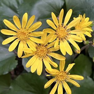 お散歩中に見たお花たち… 幸せを運ぶ黄色のお花🌼🌼🌼 ツワブキ(石蕗)×2 イソギク(磯菊) ヒャクニチソウ(百日草) ジニア(百日草) ⚫︎⚪︎⚪︎⚪︎⚪︎