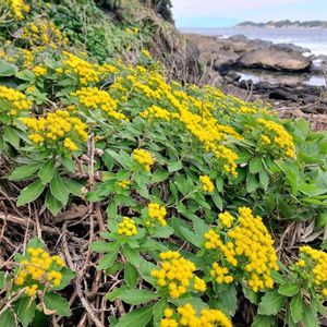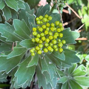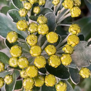 花も葉も美しい海岸の花 "イソギク" ①〜③ 秋の黄色の3点セット 第2弾 イソギク 金平糖のような筒状の黄色い花はまだ開ききっていませんでした🌼 イソギクの魅力は花だけでなく、葉の美しさと葉裏のふわふわした銀白色の毛です🍃 何故、葉っぱがこのような特徴を持っているのでしょうか🤔? それは波や風を受ける海岸の崖地という厳しい環境に適応するためのものだそうです。 海岸の遊歩道にへばり付くように咲いているイソギクが愛おしく感じました☺️ キク科、キク属の多年草 細長い地下茎を伸ばして四方に広がっていきます。 園芸品種としてのイソギクは、庭園のグランドカバーや鉢植えとしての人気もあります🪴 「城ヶ崎海岸ガイドブック」より "すみ"さんからの情報です。 ☆季節が進むとイソギクの葉っぱは美しく紅葉していきます🍁 ☆葉っぱの縁取りが美しく見えるのは葉裏の白い色がはみ出て見えるから。 すみさんありがとう💓