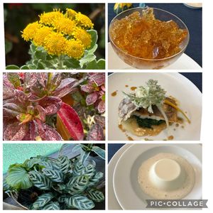 ①↖️②イソギク寒くなったら一気に咲いて来た ⬅️③ツツジ(ウオレッシュ ルビ ー)渋くてステキ〜🤎❤️ ↙️④カラテア?町のお店の前に飾ってあった🪴 ➡️お友達とフレンチ(平日女性限定ランチ)😋