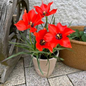 真っ赤なチューリップ🌷 ミニミニチューリップ リニフォリア👀 温かな日が続いて一気に咲きました♪ 草丈が低いので4号くらいの小さな鉢でも育てられます◎ 可愛らしいカラーが他にもたくさん! ラインアップは前回のミニミニチューリップの投稿を見てみてください💕