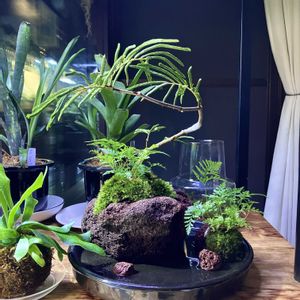 みなさんこんばんは😃 幹の折れたエバーフレッシュを 買って来てしまいました😅 折れてるのに😰 葉の大きさと幹の曲がりを気に入って買ってしまいましたが折れていたので接木テープを買って幹の折れた場所をテープで補修しました👍 その後 溶岩石の鉢に植え その鉢ごと水盤の中へ入れました😃 水盤には溶岩石を貼り付けて配置し 水を張ってます❗️ プラス苔玉風のシダも置いて 風景に一役かってます👍 涼しげでいい感じです😆 作ってから1週間ほど経ってますが幹が折れた部分の先の葉も萎れたり 色が変わったりしてないので 大丈夫かな🤔 このまま順調に育って🙏