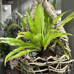 オオタニワタリの籠 昨日、自宅に自生しているオオタニ ワタリの籠を前回の余ったツルで夫 が又々作ってくれました。はみ出し 気味の鉢から籠に移したら何だか ピッタリと収まりました。(*´-`)❣️