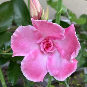 八重咲きマンデビラ ピンクパフェ✨🌸✨ 初めてお迎えしたお花。 花びらの縁が白いラインを引いたようで、ややフリルがかってて、可愛いお花です。 2pic目は、開花前日の蕾の姿。 蕾もカッコイイ😄💕