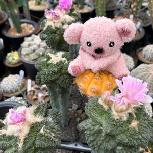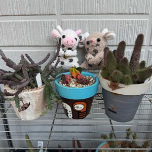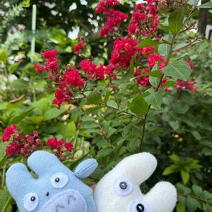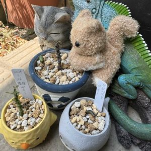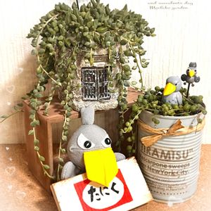 今日のお花🌸 毎月16日はトトロの日🏷️ モアイの日🏷️ くじらの日🏷️参加しまーす😁 ①サルスベリとトトロ ②モアイ鉢の寄せ植えとトトロ ③fukumomoさんのモアイ鉢とクジラ鉢 クジラ鉢の犀角は45さんにいただいた株が枯れてしまいそうになった時に少しだけ緑だった根元を挿したら新しく脇芽が伸びてきました😁 ④テレサエとミギウルティヌスのお花とクジラとまっくろくろすけ ⑤ミギウルティヌスのお花のアップ😆