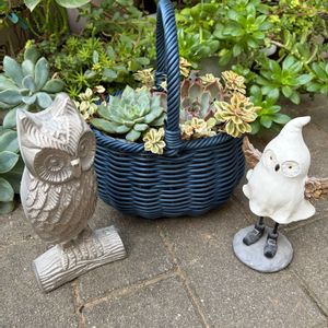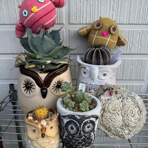 フクロウ祭🦉 幸せを呼ぶフクロウ祭り🦉 みんなでハロウィン🎃 ハロウィン月間👻参加しまーす😁 ①寄せ植えとフクロウ🦉 ②ソクフクロウ、コウモリ、ソクニャン…色々並べてみました 一応🧦サボテンもありますよぉ〜🌵 ③今季7回目の花を咲かせようとしてるミギウルティヌス