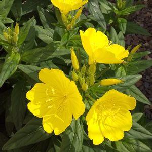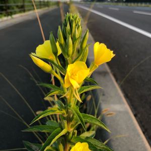 おはようございます╰(*´︶`*)╯♡ だいぶ前に散歩先で🚶♂️ 川沿いの花壇 毎年咲いてくれる ①②③ ④⑤大待宵草 大きな花🌼 雌しべが長く花びらの外まで😄