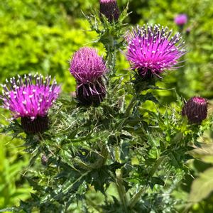 今日のお花 アザミ ミヤマコアザミ(深山小薊) あまりにもトゲが多い‼️ ノアザミの変種で石灰岩地帯に生える。 ①②③ ④ 緑が濃いのはミヤマコアザミです 花期 5月から8月 みどりのまとめ 「伊吹山」より 202576