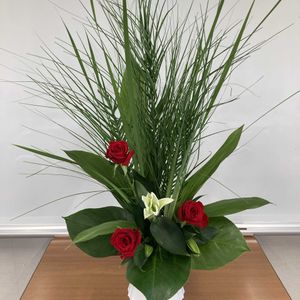 こんにちは🤗 暑い日が続きますね🥵 そんな中フラワーアレンジのお稽古に行ってきました。 お花を造花にしましょうか、という意見もありましたが、真夏もあえてお生花で、、、グリーンいっぱいで涼しげに🌸 中心に使った「アレカヤシ」のような葉っぱだけはイミテーションです😄